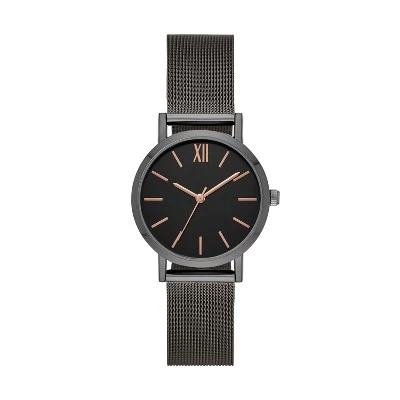 Look polished in the Roman Mesh Strap Watch from A New Day™. This minimal timepiece has a metallic dark gray watch case featuring rose gold-tone hands and minute markings that shine against a dark dial face. Buckle on the tonal stainless steel mesh watch strap and dash out the door knowing you’ll be both stylish and punctual.