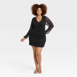 Dress up your going-out looks with this Long-Sleeve Ruched Front Bodycon Dress from A New Day™. This long-sleeve bodycon dress fashioned in a knee-length features a V-neckline, back dart details for a great fit, and a ruched front for flattering style. The lightweight, fully-lined fabric gives you a comfortable drape, while the side zip closure allows for ease of wear. Complete the look with your choice of footwear and hoop earrings.