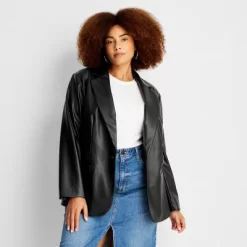 This Relaxed Fit Faux-Leather Blazer makes A New Day™ gives you endless possibilities to create unique and stylish looks. Made of midweight faux leather, this single-breasted blazer is designed in a solid hue with a notched collar, long sleeves and a single button fastening on the front to add some personality to any outfit. Pair with jeans, a tee and sneakers for a casual look, or a skirt or tailored trousers, a turtleneck and heels for a more dressed-up look.
