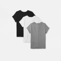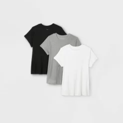 The 3-pack Short-Sleeve Ribbed Bundle T-Shirts from A New Day™ are a must-have for your year-round wardrobe. This three-pack of women’s tees includes one black, one white and one light gray T-shirt, all made of a soft fabric blend with stretch, and have a relaxed fit and below-waist length for comfortable wear, breathability and coverage. The trio of pullover T-shirts is adorned with allover ribbing for a cozy, textured look and feel, and they all sport crew necklines and short sleeves. These ribbed tees are versatile enough to wear with skirts, shorts or pants at casual family occasions, office parties or when hanging out with friends in the warmer months. Plus, they work as a great foundation layer beneath shirts, sweaters and sweatshirts during the cooler months.