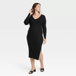 This sweater dress from A New Day™ is a stylish pick for cool-weather wear. Fashioned in a solid color, this midi dress features a flattering a V-neck, side slits and split long sleeves for better movement. The ribbed construction lends a cozy touch of texture, while the pullover design makes it easy to wear. Pair with your choice of footwear and accessories to complete the look.